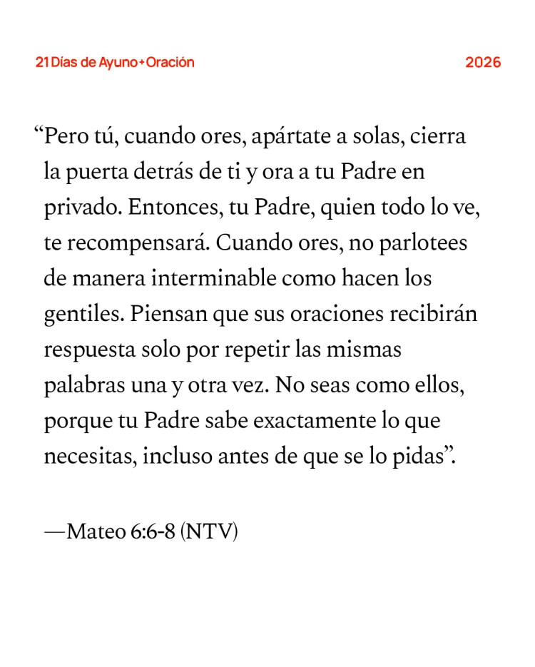 Escrituras de Hoy: “Pero tú, cuando ores, apártate a solas, cierra la puerta detrás de ti y ora a tu Padre en privado. Entonces, tu Padre, quien todo lo ve, te recompensará. Cuando ores, no parlotees de manera interminable como hacen los gentiles. Piensan que sus oraciones recibirán respuesta solo por repetir las mismas palabras una y otra vez. No seas como ellos, porque tu Padre sabe exactamente lo que necesitas, incluso antes de que se lo pidas”. —Mateo 6:6-8 (NTV)