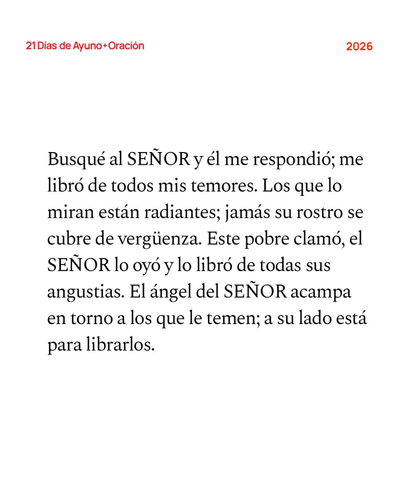 Busqué al SEÑOR y él me respondió; me libró de todos mis temores. Los que lo miran están radiantes; jamás su rostro se cubre de vergüenza. Este pobre clamó, el SEÑOR lo oyó y lo libró de todas sus angustias. El ángel del SEÑOR acampa en torno a los que le temen; a su lado está