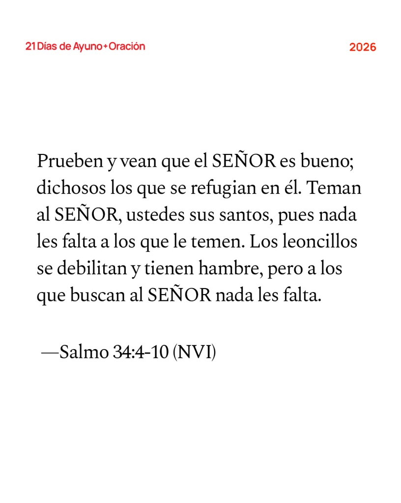 para librarlos. Prueben y vean que el SEÑOR es bueno; dichosos los que se refugian en él. Teman al SEÑOR, ustedes sus santos, pues nada les falta a los que le temen. Los leoncillos sé debilitan y tienen hambre, pero a los que buscan al SEÑOR nada les falta. —Salmo 34:4-10 (NVI)