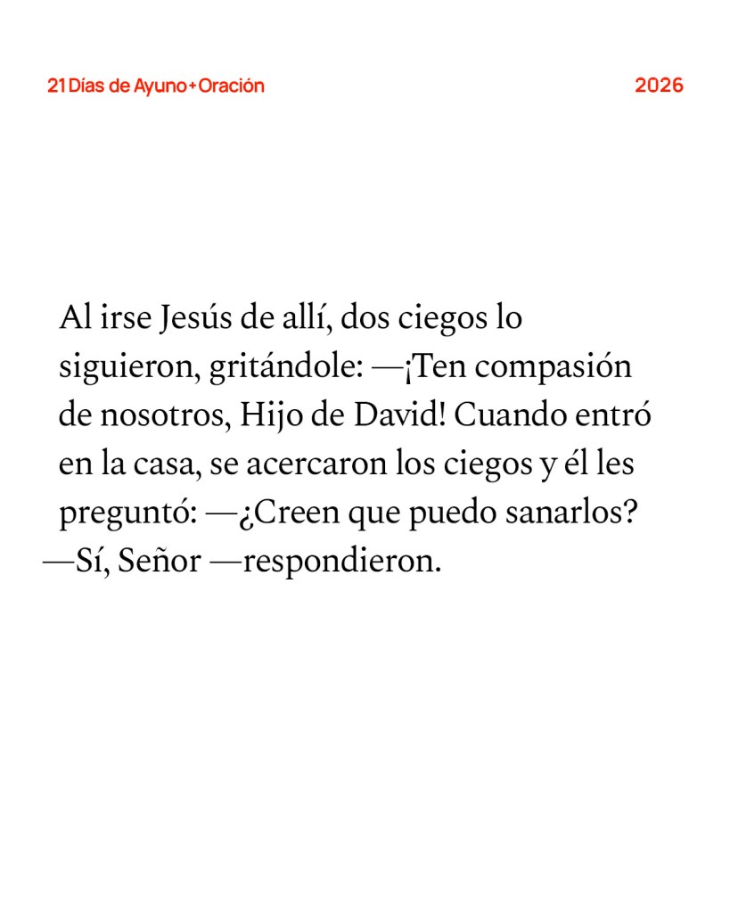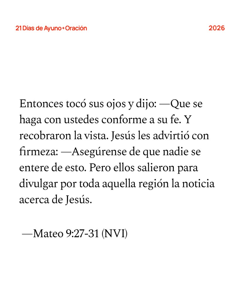 Al irse Jesús de allí, dos ciegos lo siguieron, gritándole: —¡Ten compasión de nosotros, Hijo de David! Cuando entró en la casa, se acercaron los ciegos y él les preguntó: —¿Creen que puedo sanarlos? — Sí, Señor —respondieron. Entonces tocó sus ojos y dijo: —Que se haga con ustedes conforme a su fe. Y recobraron la vista. Jesús les advirtió con firmeza: Asegúrense de que nadie se entere de esto. Pero ellos salieron para divulgar por toda aquella región la noticia acerca de Jesús. —Mateo 9:27-31 (NVI)