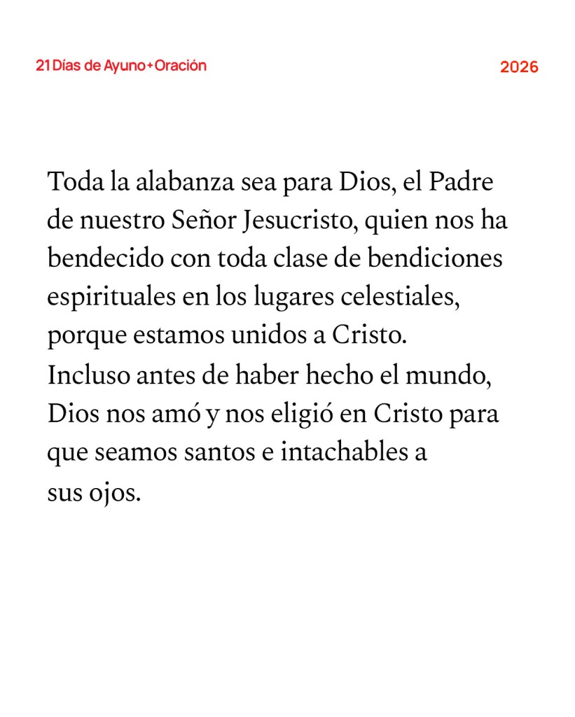 Toda la alabanza sea para Dios, el Padre de nuestro Señor Jesucristo, quien nos ha bendecido con toda clase de bendiciones espirituales en los lugares celestiales, porque estamos unidos a Cristo. Incluso antes de haber hecho el mundo, Dios nos amó y nos eligió en Cristo para que seamos santos e intachables a sus ojos. Dios decidió de antemano adoptarnos como miembros de su familia al acercarnos a sí mismo por medio de Jesucristo. Eso es precisamente lo que él quería hacer, y le dio gran gusto hacerlo. De manera que alabamos a Dios por la abundante gracia que derramó sobre nosotros, los que pertenecemos a su Hijo amado. —Efesios 1:3-6 (NTV)