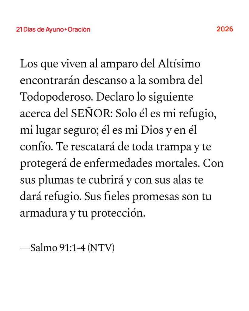Los que viven al amparo del Altísimo encontrarán descanso a la sombra del Todopoderoso. Declaro lo siguiente acerca del SEÑOR: Solo él es mi refugio, mi lugar seguro; él es mi Dios y en él confío. Te rescatará de toda trampa y te protegerá de enfermedades mortales. Con sus plumas te cubrirá y con sus alas te dará refugio. Sus fieles promesas son tu armadura y tu protección. —Salmo 91:1-4 (NTV)