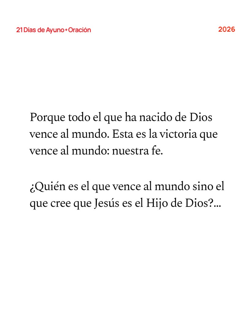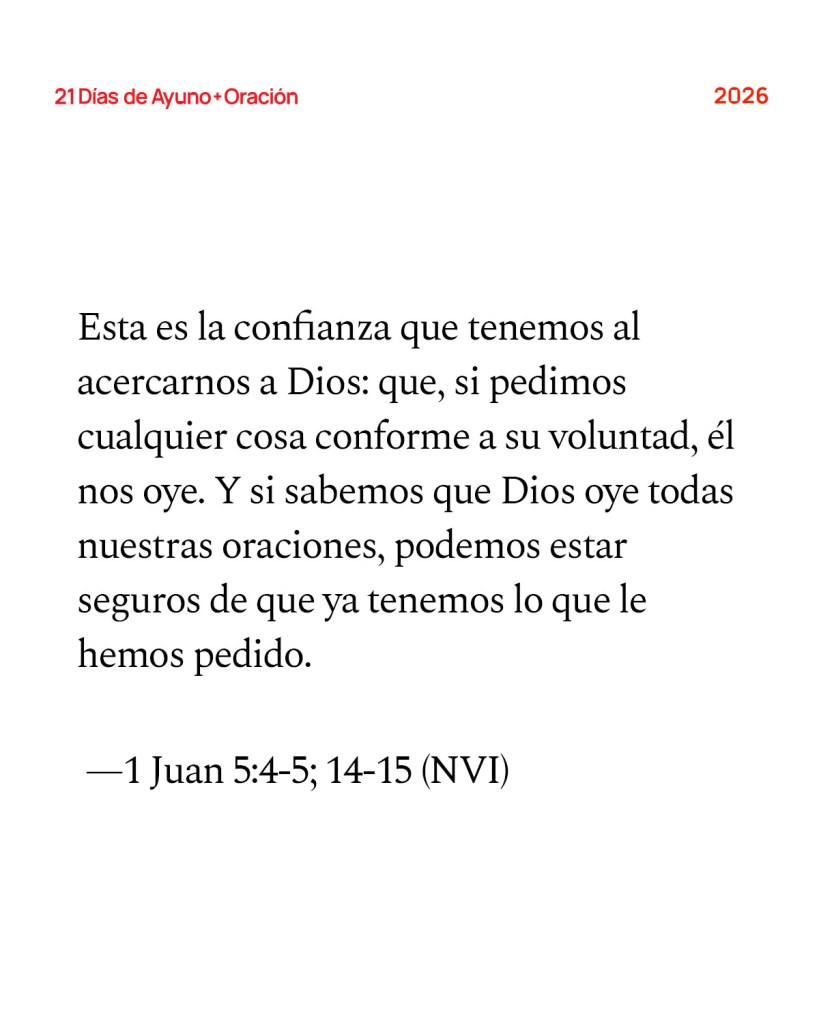 Porque todo el que ha nacido de Dios vence al mundo. Esta es la victoria que vence al mundo: nuestra fe. ¿Quién es el que vence al mundo sino el que cree que Jesús es el Hijo de Dios?… Esta es la confianza que tenemos al acercarnos a Dios: que, si pedimos cualquier cosa conforme a su voluntad, él nos oye. Y si sabemos que Dios oye todas nuestras oraciones, podemos estar seguros de que ya tenemos lo que le hemos pedido. —1 Juan 5:4-5; 14-15 (NVI)