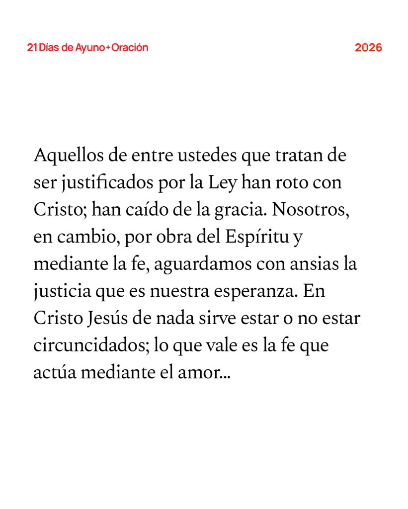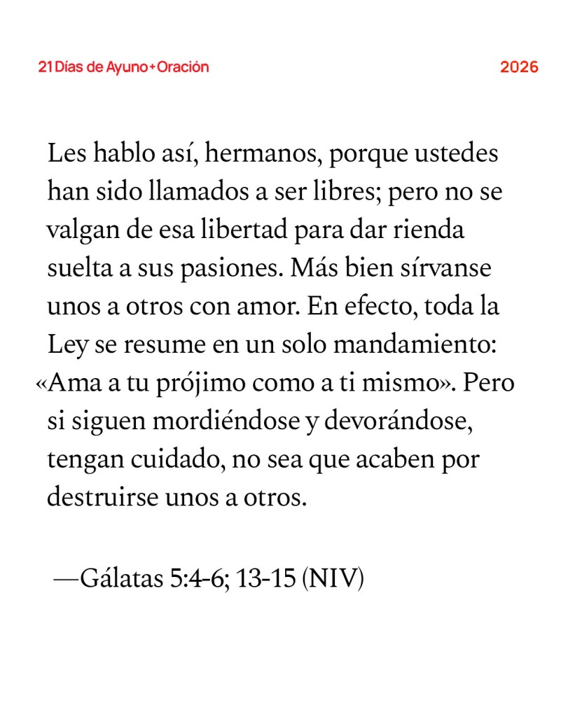 Aquellos de entre ustedes que tratan de ser justificados por la Ley han roto con Cristo; han caído de la gracia. Nosotros, en cambio, por obra del Espíritu y mediante la fe, aguardamos con ansias la justicia que es nuestra esperanza. En Cristo Jesús de nada sirve estar o no estar circuncidados; lo que vale es la fe que actúa mediante el amor… Les hablo así, hermanos, porque ustedes han sido llamados a ser libres; pero no se valgan de esa libertad para dar rienda suelta a sus pasiones. Más bien sírvanse unos a otros con amor. En efecto, toda la Ley se resume en un solo mandamiento: «Ama a tu prójimo como a ti mismo». Pero si siguen mordiéndose y devorándose, tengan cuidado, no sea que acaben por destruirse unos a otros. —Gálatas 5:4-6; 13-15 (NVI)