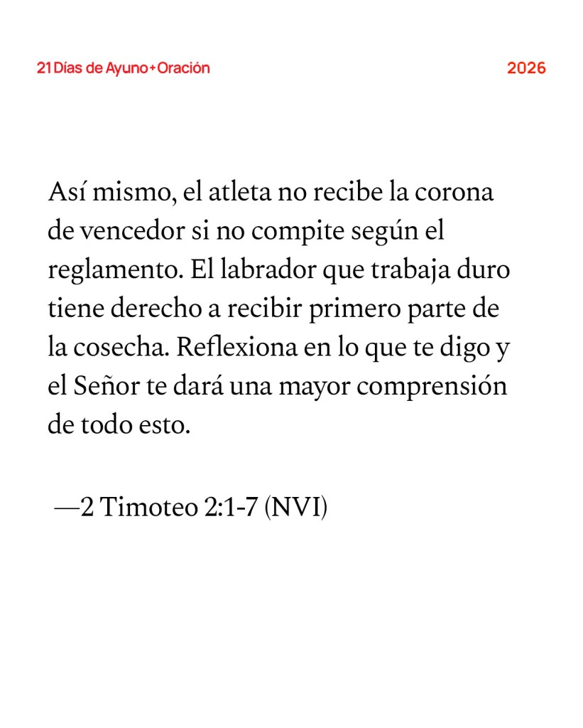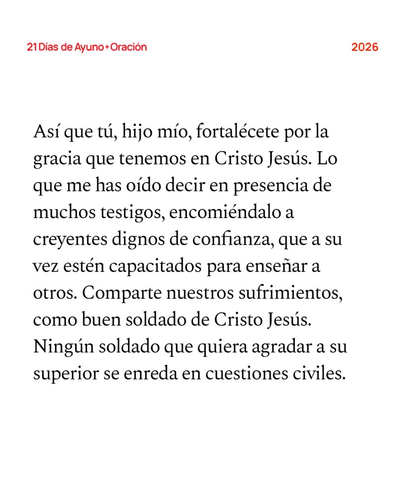 Escritura de hoy: Así que tú, hijo mío, fortalécete por la gracia que tenemos en Cristo Jesús. Lo que me has oído decir en presencia de muchos testigos, encomiéndalo a creyentes dignos de confianza, que a su vez estén capacitados para enseñar a otros. Comparte nuestros sufrimientos, como buen soldado de Cristo Jesús. Ningún soldado que quiera agradar a su superior se enreda en cuestiones civiles. Así mismo, el atleta no recibe la corona de vencedor si no compite según el reglamento. Él labrador que trabaja duro tiene derecho a recibir primero parte de la cosecha. Reflexiona en lo que te digo y el Señor te dará una mayor comprensión de todo esto. —2 Timoteo 2:1-7 (NVI)