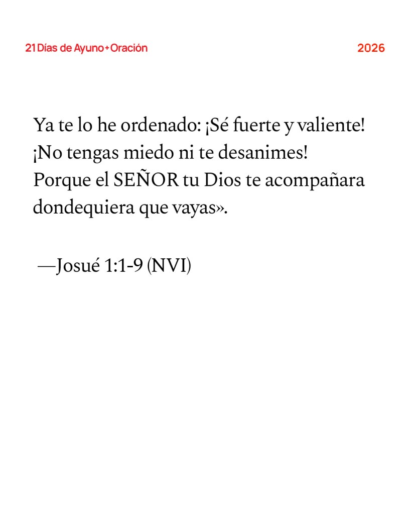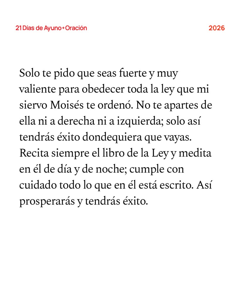 no te dejaré ni te abandonaré. Sé fuerte y valiente porque tú harás que este pueblo herede la tierra que prometí a sus antepasados. Solo te pido que seas fuerte y muy valiente para obedecer toda la ley que mi siervo Moisés te ordenó. No te apartes de ella ni a derecha ni a izquierda; solo así tendrás éxito dondequiera que vayas. Recita siempre el libro de la Ley y medita en él de día y de noche; cumple con cuidado todo lo que en él está escrito. Así prosperarás y tendrás éxito. Ya te lo he ordenado: ¡Sé fuerte y valiente! ¡No tengas miedo ni te desanimes! Porque el SEÑOR tu Dios te acompañará dondequiera que vayas». —Josué 1:1-9 (NVI)