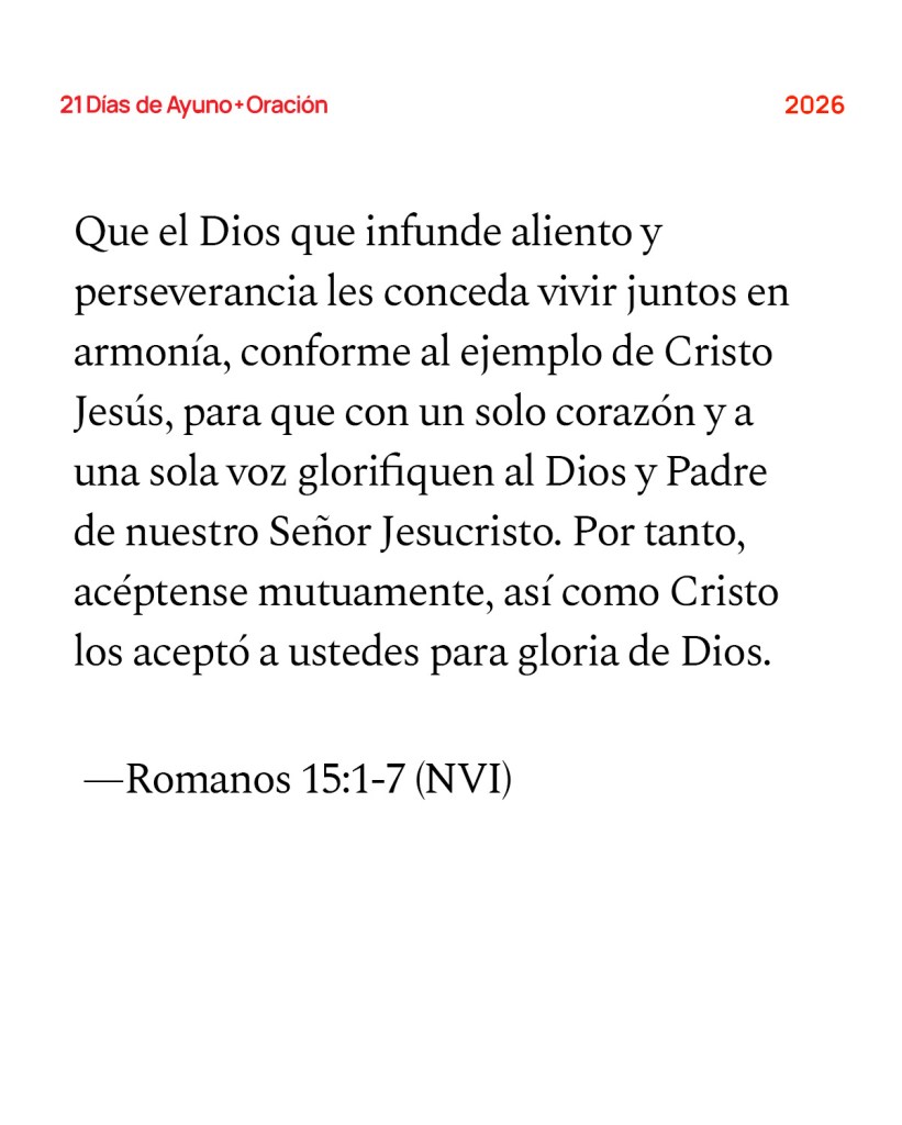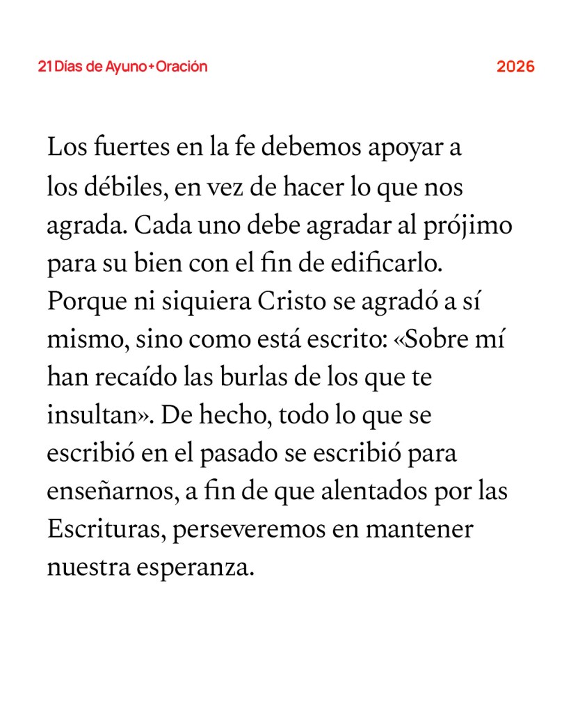 Los fuertes en la fe debemos apoyar a los débiles, en vez de hacer lo que nos agrada. Cada uno debe agradar al prójimo para su bien con el fin de edificarlo. Porque ni siquiera Cristo se agradó a sí mismo, sino cómo está escrito: «Sobre mí han recaído las burlas de los que te insultan». De hecho, todo lo que se escribió en el pasado se escribió para enseñarnos, a fin de que alentados por las Escrituras, perseveremos en mantener nuestra esperanza. Que el Dios que infunde aliento y perseverancia les conceda vivir juntos en armonía, conforme al ejemplo de Cristo Jesús, para que con un solo corazón y a una sola voz glorifiquen al Dios y Padre de nuestro Señor Jesucristo. Por tanto, acéptense mutuamente, así como Cristo los aceptó a ustedes para gloria de Dios. —Romanos 15:1-7 (NVI)