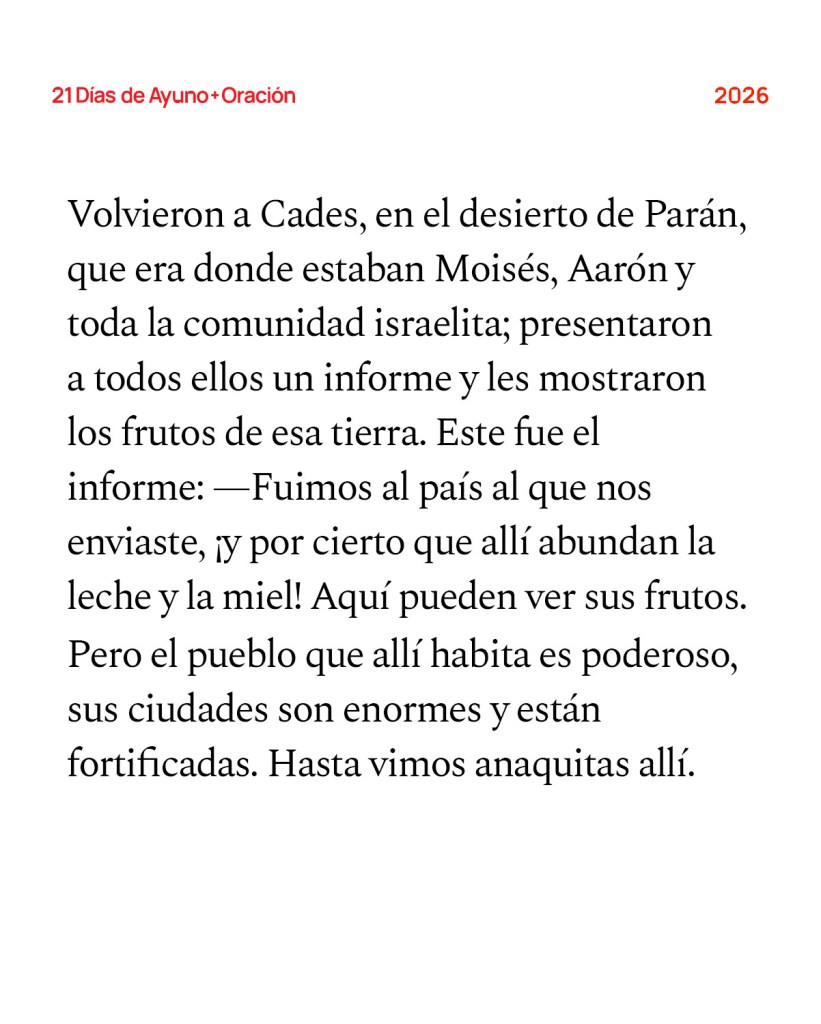 Escritura de hoy: Volvieron a Cades, en el desierto de Parán, que era donde estaban Moisés, Aarón y toda la comunidad israelita; presentaron a todos ellos un informe y les mostraron los frutos de esa tierra. Este fue el informe: —Fuimos al país al que nos enviaste, ¡y por cierto que allí abundan la leche y la miel! Aquí pueden ver sus frutos. Pero el pueblo que allí habita es poderoso, sus ciudades son enormes y están fortificadas. Hasta vimos anaquitas allí. Los amalecitas habitan el Néguev; los hititas, jebuseos y amorreos viven en la montaña, y los cananeos ocupan la zona costera y la ribera del río Jordán. Caleb hizo callar al pueblo ante Moisés y dijo: —Subamos a conquistar esa tierra. Estoy seguro de que podremos hacerlo. —Números 13:26-30 (NVI)
