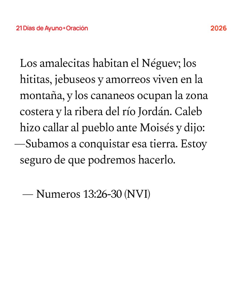 Reflexione en la Palabra: Los israelitas se encuentran en el umbral de la Tierra Prometida. Dios los ha librado de muchas maneras en su travesía desde Egipto. Ellos envían espías para explorar la tierra que Dios les había prometido. Es tal como Dios les dijo que sería. Pero creen que los gigantes les impedirán poseerla. Caleb (y en otros pasajes también Josúe) es el único que confía en que Dios cumplirá lo que ha prometido. ¿Con qué frecuencia somos como los israelitas? Olvidamos fácilmente las cosas que Dios ha hecho en el pasado: en nuestras propias vidas, a lo largo de la historia y en la Biblia. Pero servimos a un Dios que hace cosas milagrosas. Servimos a un Dios que tiene el control total de todo. No hay razón para dudar de Dios ni pensar que alguna petición es demasiado grande para Él. Jesús nos asegura en Juan 14 que si ofrecemos nuestras oraciones en el nombre de Jesús (si se alinean con la voluntad de Dios), se cumplirán. Nosotros, como Caleb, debemos declarar con confianza que Dios cumplirá lo que ha prometido. Puede que no se cumpla de la manera ni en el momento que esperamos, pero el reino de Dios vendrá. Su voluntad se hará. Podemos pedir grandes cosas del reino con fe, y Dios nos escuchará. Dios actuará. Ningún gigante ni ninguna maquinación del enemigo nos impedirá poseer la tierra que Dios nos ha dado.