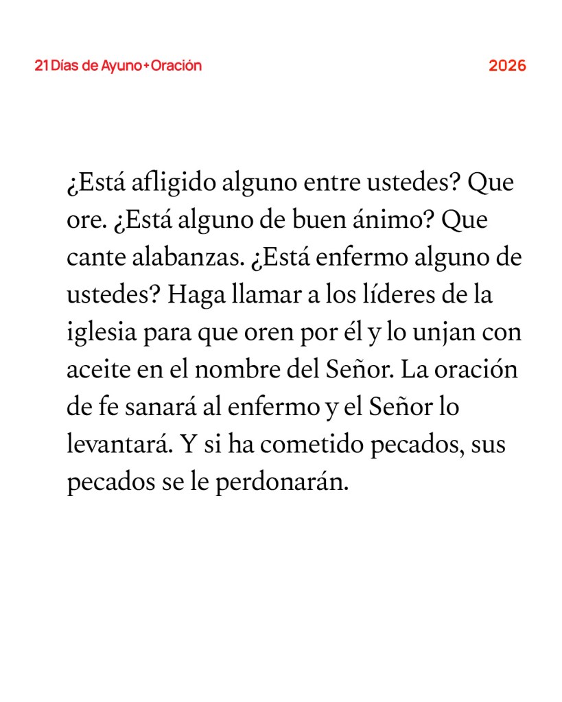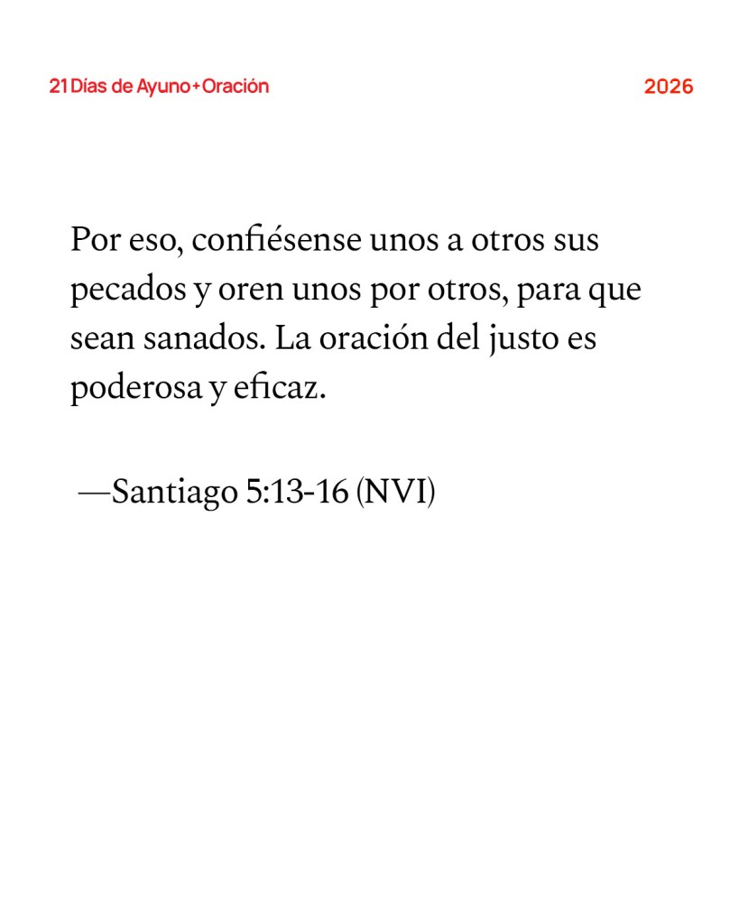 Reflexione en la Palabra: Nuestro Dios es sanador. Nuestro Dios es el gran reconciliador. Nuestro Dios es quien levanta a los humildes y es Padre de los huérfanos. Como personas de fe, nos mantenemos firmes en las promesas, en el carácter de Dios, sin importar lo que se cruce en nuestro camino. Las palabras de Santiago son el antídoto contra la forma en que solemos extraviarnos. La fe no es un idealismo esperanzador—es una realidad que se practica en comunidad con otros. Cuando estamos en problemas, necesitamos orar juntos. Cuando estamos felices, necesitamos celebrar juntos. Cuando estamos enfermos, necesitamos contender juntos en oración. Cuando tropezamos en el pecado, debemos confesarlo y recibir misericordia juntos. Nuestra fe siempre tuvo como propósito acercarnos a Dios y a la comunidad, y al hacerlo, descubriremos la verdad de quién es Él. Orar por los demás es una manera de poseer territorio que antes estaba en manos del enemigo. Ya sea que las personas por las que oramos entren o no por las puertas de nuestra iglesia, ya sea que sepamos o no si aceptan a Jesús—cuando oramos por su sanidad y las elevamos ante el Padre, las sacamos del territorio del enemigo y las llevamos al territorio de Dios. Al ofrecer esperanza y sanidad a quienes se encuentran en lugares oscuros, les traemos la luz de Cristo y desterramos el poder del enemigo.
