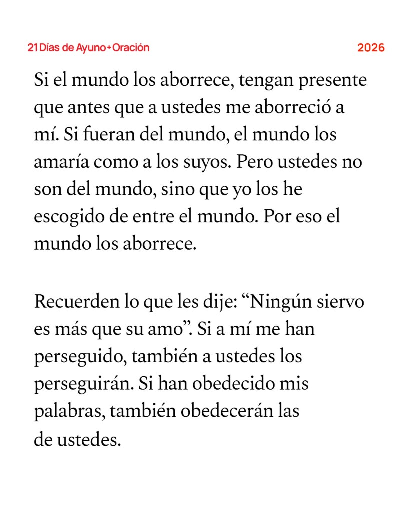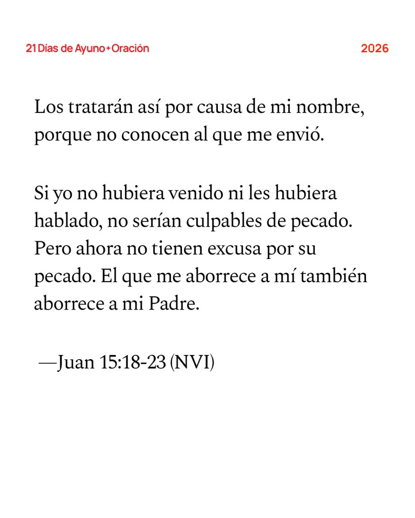 Si el mundo los aborrece, tengan presente que antes que a ustedes me aborreció a mí. Si fueran del mundo, el mundo los amaría como a los suyos. Pero ustedes no son del mundo, sino que yo los he escogido de entre el mundo. Por eso el mundo los aborrece. Recuerden lo que les dije: “Ningún siervo es más que su amo”. Si a mí me han perseguido, también a ustedes los perseguirán. Si han obedecido mis palabras, también obedecerán las de ustedes. Los tratarán así por causa de mi nombre, porque no conocen al que me envió. Si yo no hubiera venido ni les hubiera hablado, no serían culpables de pecado. Pero ahora no tienen excusa por su pecado. El que me aborrece a mí también aborrece a mi Padre. —Juan 15:18-23 (NVI)