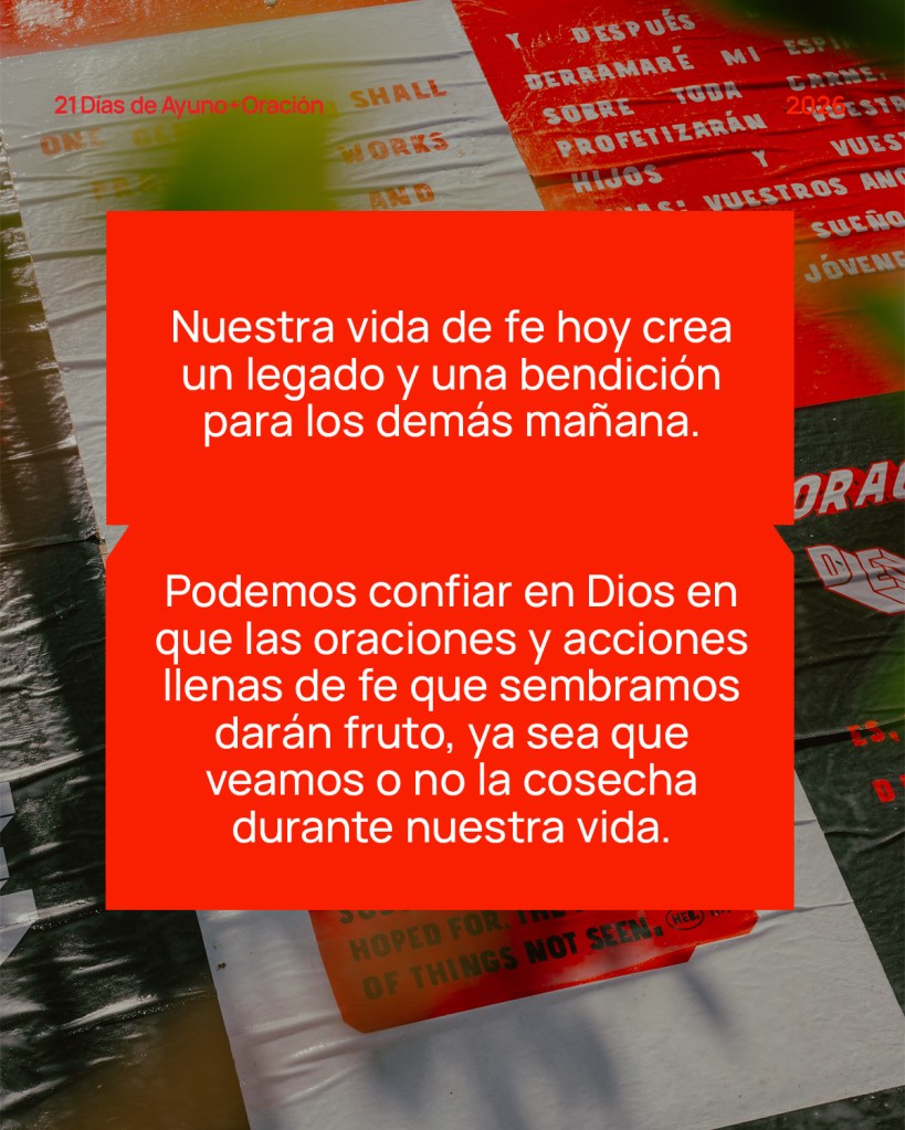 Nuestra vida de fe hoy crea un legado y una bendición para los demás mañana. Podemos confiar en Dios en que las oraciones y acciones llenas de fe que sembramos darán fruto, ya sea que veamos o no la cosecha durante nuestra vida.