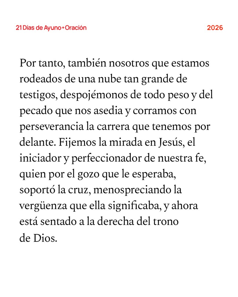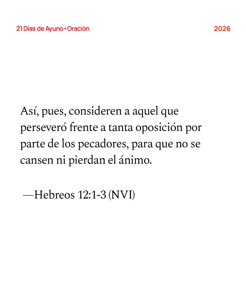 - Comprométase a orar las palabras de Hebreos 12:1-3 por la iglesia y por su propia vida al finalizar nuestros 21 Días de Ayuno + Oración. Ore que seamos personas que reflejen la ciudad celestial a un mundo dolido, pase lo que pase.